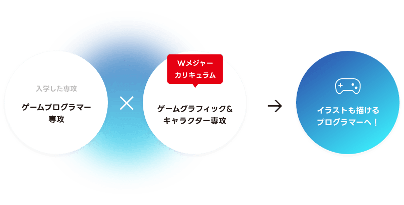 企画・デザイン・プログラム、ゲーム分野すべての専攻が揃う学校のメリットをフル活用することができます。